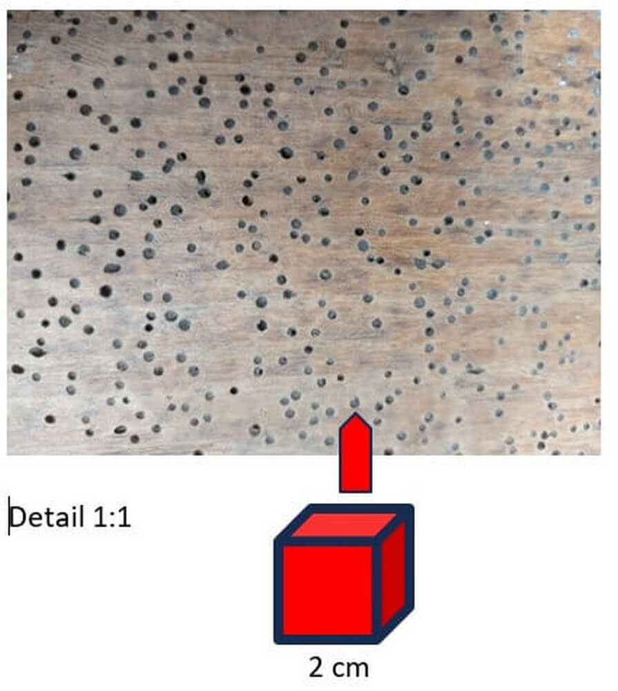 Pri meraní v špecializovaných laboratóriách bolo zaznamenané, že za jedným identifikovaným otvorom s priemerom cca 2mm sa nachádza požerková chodbička v dĺžke cca 10- 15 m, čo predstavuje materiál dreva pretvorený na prach v objeme 8 cm³ (kocka s hranami 2cm ). Pri veľkom výskyte výletových otvorov a tým aj početnej koncentrácii drevokazného hmyzu môže prísť k zásadným stabilizačným a tvarovým deštrukciám predmetu resp. úplnej deštrukcií hmotnej podstaty pamiatky.