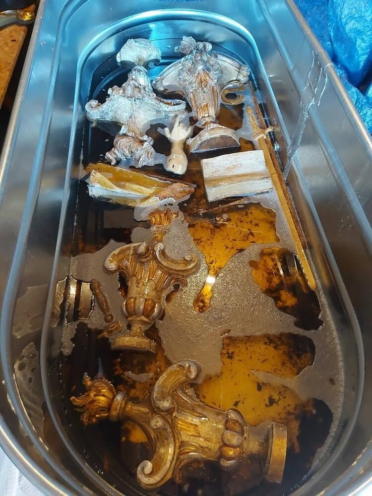 Reštaurátorský proces ktorý bude nasledovať po odparení rozpúšťadla začína skladaním oddelených častí, zlepením a rehabilitáciou narušených spojov, rekonštrukciou v hmote to znamená dorezaním chýbajúcich častí, tmelením, plastickou rekonštrukciou podkladov, rekonštrukciou zlátenia a nakoniec nasleduje farebná retuš.