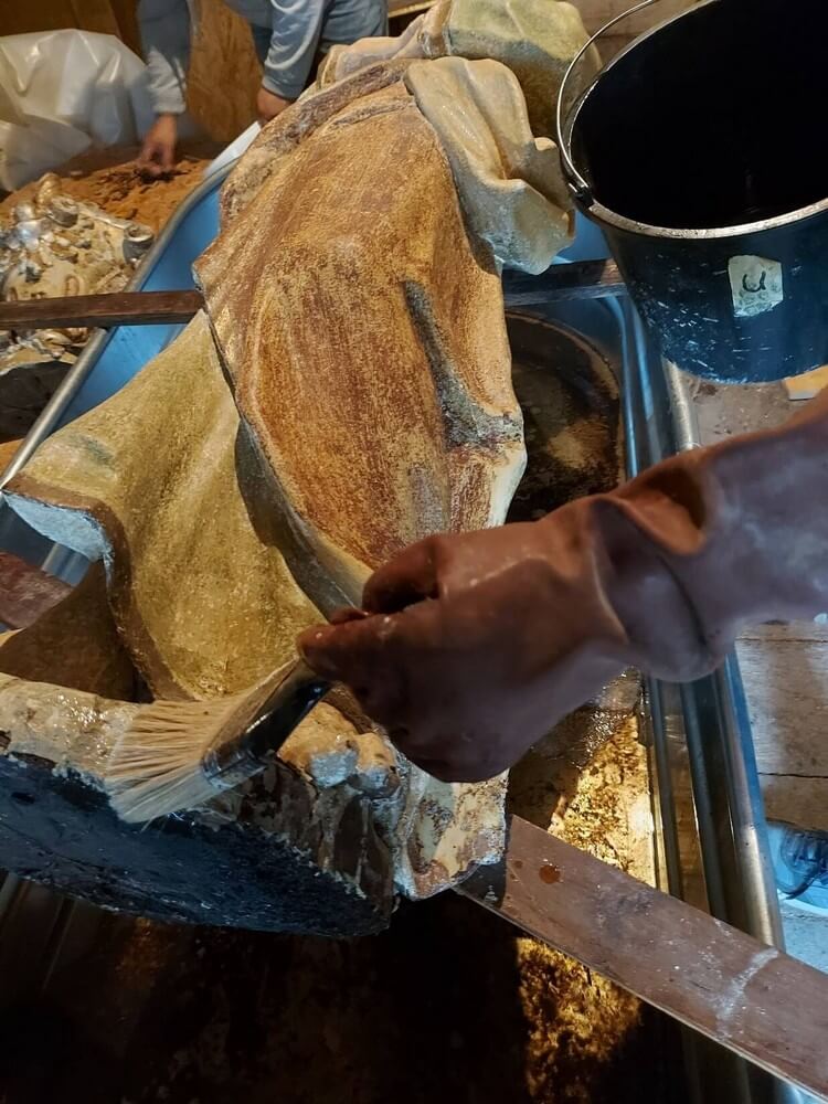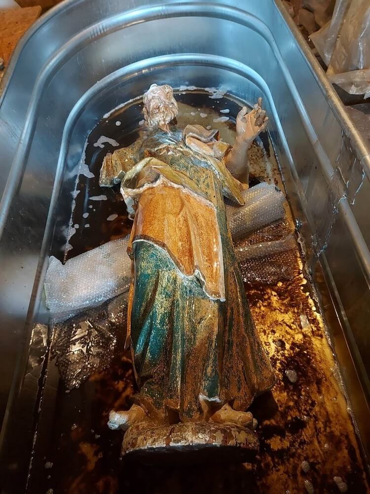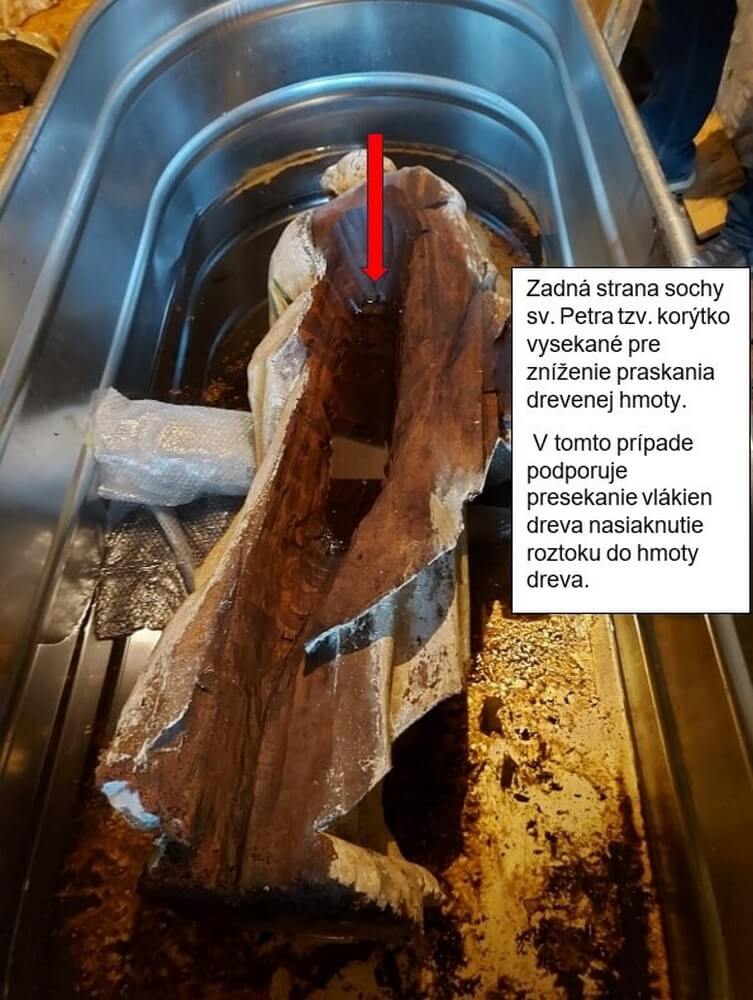 Napúšťanie zadnej strany sochy sv. Pavla.